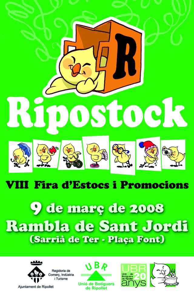 La Unió de Botiguers i la Regidoria de Comerç de l'Ajuntament de Ripollet han organitzat per aquest 9 de març la vuitena edició la tradicional Fira d'Estocs i Promocions de Ripollet, Ripostock. En aquesta ocasió, s'instal·larà a la rambla de Sant Jordi, al tram comprès entre els carrers de Sarrià de Ter fins la plaça Font. Hi haurà una quaratena d'estands, una quarta d'expositors nous, a més d'inflables per als més petits i animació a càrrec de l'Esplai La Gresca. La UBR també ha previst la instal·lació de dues carpes on es podrà realitzar l'intercanvi de cromos per l'àlbum 'Ripollet, Pas a Pas'.