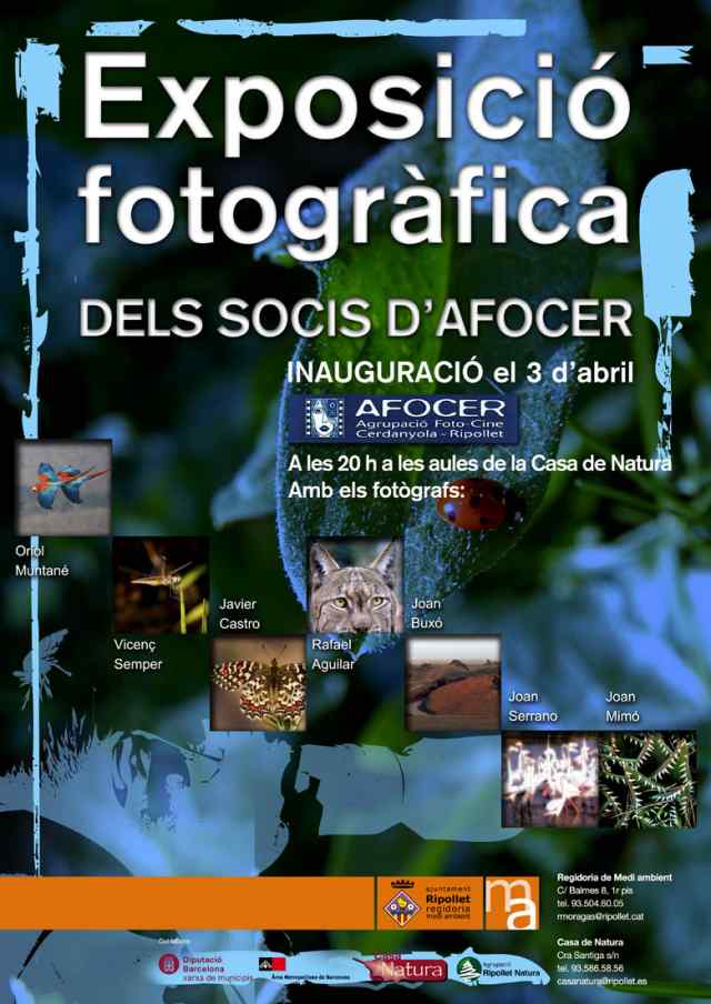 La mostra fotogràfica comptarà amb obres d'Oriol Muntané, Vicenç Semper, Javier Castro, Rafael Aguilar, Joan Buxó, Joan Serrano i Joan Mimó, tots ells socis de l'Agrupació Foto-Cine Cerdanyola-Ripollet. L'exposició serà inaugurada el proper dia 3, a les 13 hores a la Casa de Natura.