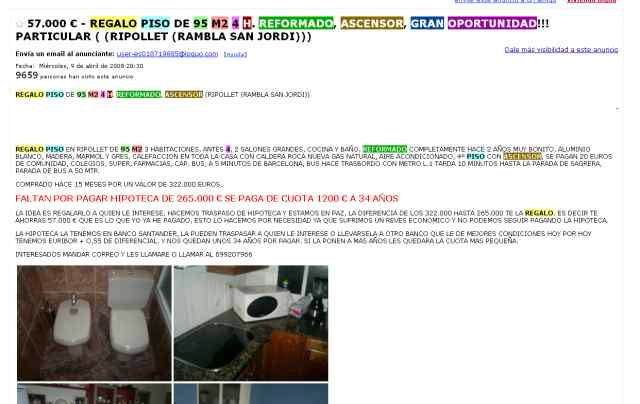 La premsa d'arreu del país s'ha fet ressò aquest cap de setmana de l'anunci que una parella de Ripollet ha publicat a Internet on diu “regalo pis de 95 metres quadrats”. La realitat és que, davant la impossibilitat de pagar la quota de la seva hipoteca, el matrimoni s'ha vist obligat a posar a la venda el seu pis sense obtenir cap tipus de benefici.