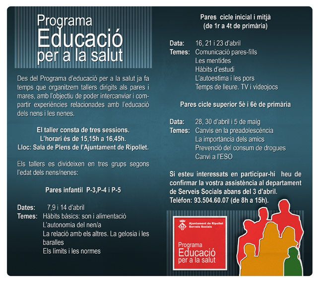 El departament de Serveis Socials ha organitzat un any més el cicle de xerrades per a mares i pares dels escolars de Ripollet, en el marc del Programa d'Educació per a la Salut i prevenció de les drogodependències. L'objectiu d'aquestes xerrades, a càrrec de la psicòloga Sílvia Martínez, és poder intercanviar i compartir experiències relacionades amb l'educació dels nens i nenes.