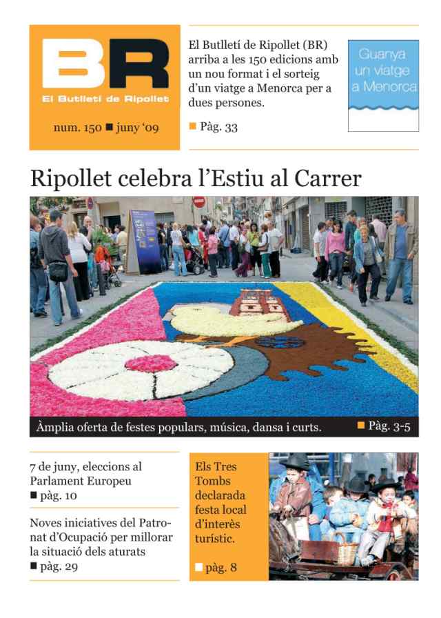 Amb motiu de l'edició del número 150, el BR vol premiar la fidelitat dels seus lectors amb la rifa d'un viatge per a dues persones de 4 dies (3 nits) a realitzar del 16 al 19 de juliol d'enguany a Menorca. El premi inclou 2 passatges d'avió en Spanair i trasllat a l'hotel i allotjament en habitació doble i pensió completa a l'Hotel Barceló Hamilton, situat a Mahó (Menorca). Per optar a aquest premi caldrà emplenar el cupó que hi ha a sota i dipositar-lo en una urna, instal·lada al Centre Cultural. El sorteig tindrà lloc l'11 de juny a les 11 hores, cara al públic, al peu de les instal·lacions del Patronat de Comunicació, a la rambla de Sant Jordi, 6. També es podrà siguir en directe per Ripollet Ràdio (91.3 FM) i ripollet.cat. Patrocinat per Almeida Viajes, c/ del Sol, 39. Telf. 93 594 86 92.