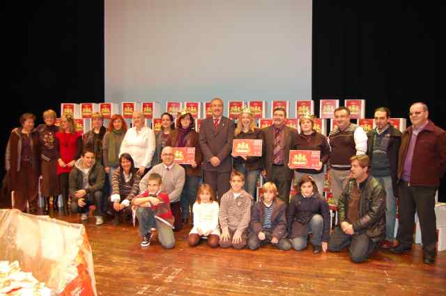 FOTO 1: Les tres guanyadores amb el val de 3.000 euros acompanyades per la presidenta de la UBR, Maria Villariño, l'alcalde de Ripollet, Juan Parralejo i el regidor de Comerç, Joan Fandos. També apareixen a la foto el presentador de l'acte, Toni Miralles, i els membres de la junta de la UBR, responsables de l'organització del sorteig, així com els nens i nenes que van participar a l'acte.