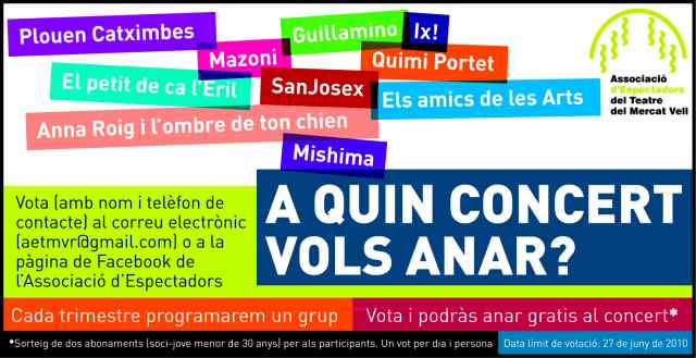 L'Associació d'Espectadors del Teatre del Mercat Vell ha posat en marxa la campanya 'A quin concert vols anar?', que vol aconseguir la participació dels joves en la selecció dels grups de música que es programaran en la propera temporada d'espectacles professionals del Teatre Auditori. L'entitat ha fet pública una llista perquè els joves triïn els seus grups preferits. Les tres formacions amb més vots es programaran durant la temporada 2010-2011, una cada trimestre.