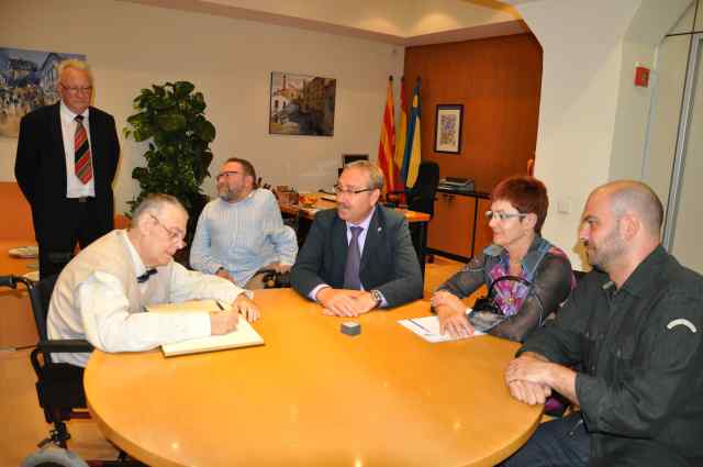 FOTO2: Signant al Llibre d'Honor acompanyat per (d'esquerra a dreta) Modest Serra, el regidor de Relacions Institucionals, Alberto Castro, l'alcalde de Ripollet, Juan Parralejo, la dona del Dr. Boquet, Maria Dolors i el regidor de Cultura, Ferran Tornel.