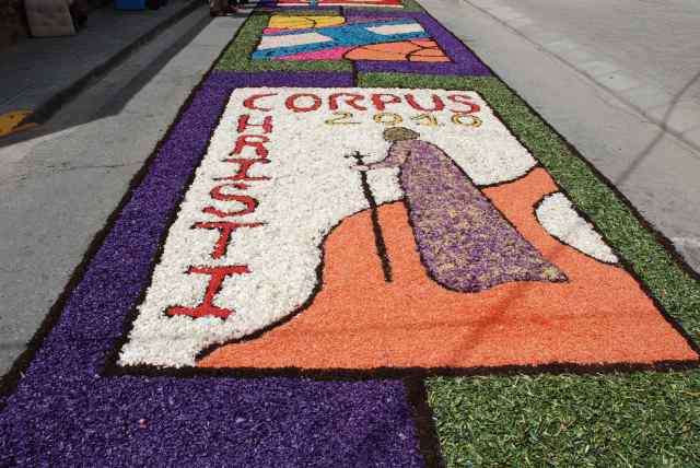 Per la seva elaboració es necessitaran 10.000 clavells de colors groc, vermell i blanc, terres minerals i vegetals, cupré tallat, serradures grises i vermelles, encenalls tenyits blaus, pradella marró, sorra negra, llavors de lli, llegums tenyides i terra d'esclòfies de pinyó. Es preveu que les catifes es podran visitar el dilluns dia 8 de novembre fins que es marceixi la flor.