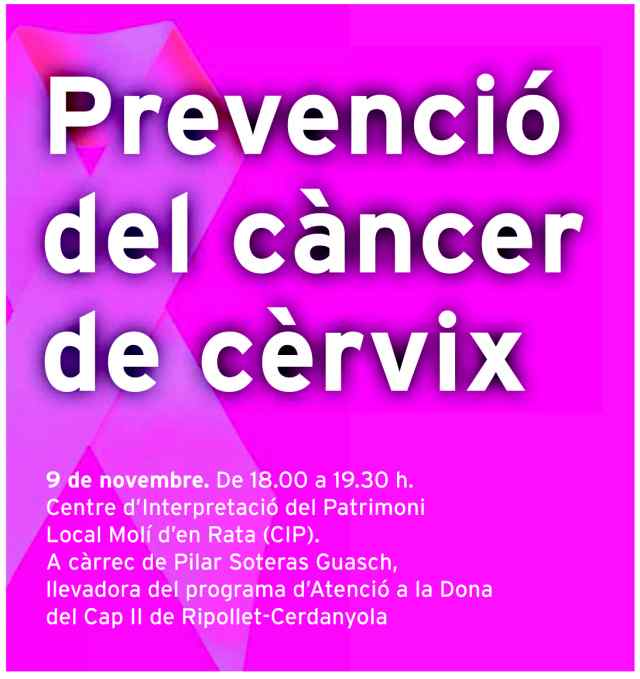 El CIP acollirà el proper 9 de novembre una xerrada a les sis de la tarda sobre la 'Prevenció del càncer de cèrvix' a càrrec de Pilar Soteras Guasch, llevadora del Programa d'atenció de la dona del Cap II Cerdanyola-Ripollet. Així es parlarà del càncer de coll d'úter, de la seva prevenció i dels recursos assistencials disponibles al municipi. Un altre dels temes serà la vacuna del papil·loma, tema d'actualitat en els darrers mesos.