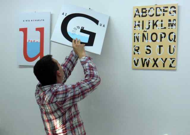 Foto: Agustín Calvo muntant la mostra a la biblioteca.