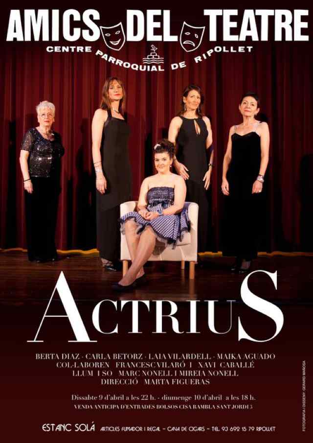 Aquest cap de setmana Amics del Teatre posa sobre l'escenari del Centre Parroquial l'obra Actrius. El muntatge està dirigit per Marta Figueras i compta amb les interpretacions de Berta Díaz, Carla Betorz, Laia Vilardell i Maika Aguado, juntament amb la col·laboració de Francesc Vilaró i Xavi Caballé. Les representacions es realitzaran el dissabte, 9 d'abril, a les 22 h i diumenge, 10 d'abril, a les 18 h.