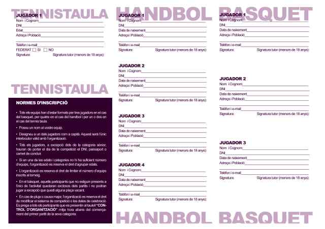 El Patronat Municipal de Cultura ha obert el termini d'inscripcions per participar al Torneig de Bàsquet 3x3, al d'Handbol i a la Gimcana/Torneig de Tenis Taula que tindran lloc amb motiu de la Festa Major 2011. Durant tot el mes de juliol i del 22 al 26 d'agost es podran recollir al Centre Cultural les butlletes d'inscripció, que un cop omplertes s'han de lliurar al mateix centre.