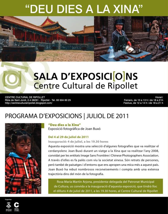 La Sala 1 del Centre Cultural acull des del dilluns, 4 de juliol, i fins el dia 29 l'exposició Deu dies a la Xina. Es tracta d'una mostra amb una selecció de fotografies realitzades pel cerdanyolenc Joan Buxó durant un viatge a la Xina que va fer l'any 2008, convidat per Image Sans Frontière i Chinese Photographers Association. A través d'elles fa palès com viu la societat xinesa. D'altra banda, el proper 7 de juliol, a les 19.30 h, s'inaugurarà a la Sala d'Art del Centre Cultural l'exposició Vietnam. Fotografies de Joan Mimó i Carles Verdú.