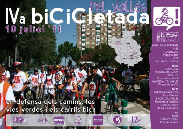 El diumenge, 10 de juliol, Cerdanyola acollirà la IV Bicicletada del Vallès, organitzada per les Candidatures Alternatives del Vallès. Els participants sortiran el matí de diumenge des de diferents municipis de la comarca amb la finalitat de trobar-se a Cerdanyola, on els amfitrions realitzaran una petita ruta que visitarà els diferents abocadors de la ciutat. En acabar, tothom que hagi participat podrà gaudir d'un esmorzar Al Parc de la Riera.