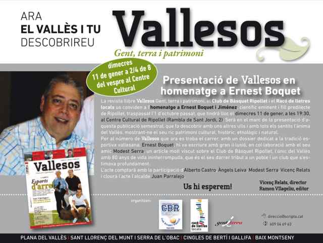 El segon número de la revista Vallesos publica el darrer article que el científic i fill predilecte de Ripollet, Ernest Boquet, va escriure amb el seu amic Modest Serra, en relació al Club de Bàsquet Ripollet. Boquet havia estat jugador d'aquest club, l'únic del Vallès amb 80 anys de vida ininterrompuda, i va ser soci d'honor fins la seva mort, l'octubre passat. La revista Vallesos serà presentada el proper 11 de gener, a les 19.30 a la Sala d'actes del Centre Cultural, en un acte que vol homenatjar la figura d'aquest il·lustre vallesà.