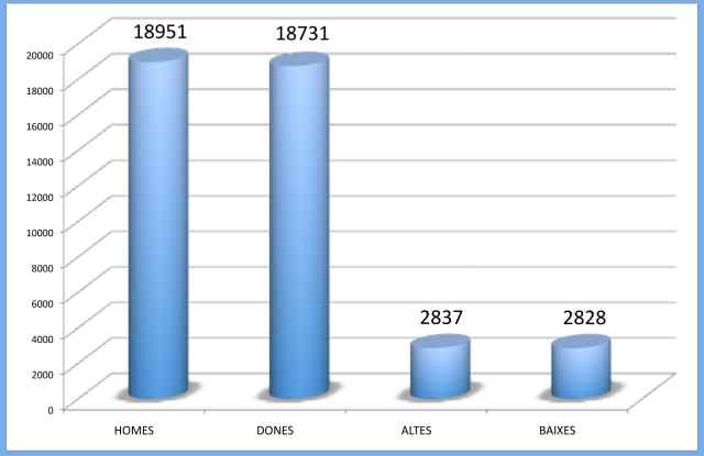 Pel que fa a les baixes, s'han produït 2.828, 146 per defunció i, quant a moviments interns, s'han efectuat 1748 apunts per canvis de domicili. Pel que fa a la població estrangera, es continua amb la tendència de l'any anterior, amb una lleugera disminució d'aquest sector de la població. Dels 4.570 inscrits a 2011, comptem amb 4.347 enguany.
