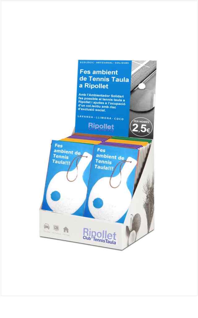 El proper diumenge 22 d'abril, coincidint amb la celebració del Sant Jordi a la Rambla, el Club Tennis Taula Ripollet presentarà la campanya solidària "Fes ambient de Tennis Taula a Ripollet". Aquesta consisteix en la venda d'un ambientador ecològic i solidari en forma de pala de ping-pong, que han elaborat artesanalment i en exclusiva per al CTT Ripollet, persones amb discapacitat del Centre Especial de Treball de la Fundació President Amat Roumen (Fupar) de Terrassa.