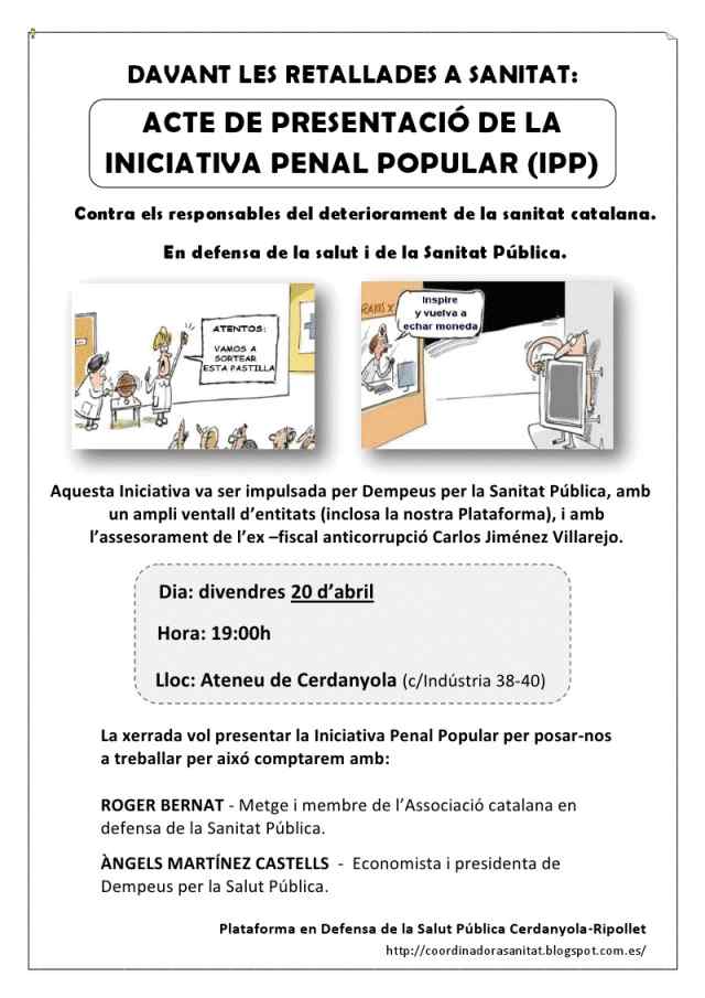 Aquest divendres, 20 d'abril, a l'Ateneu de Cerdanyola del Vallès, la Plataforma en Defensa de la Sanitat Pública de Cerdanyola-Ripollet, presenta una Iniciativa Penal Popular, "contra els responsables del deteriorament de la sanitat catalana". Aquesta incitativa ha estat impulsada per Dempeus per la Sanitat Pública, amb el suport de moltes entitats i el suport de l'exfiscal anticorrupció Carlos Jiménez Villarejo.