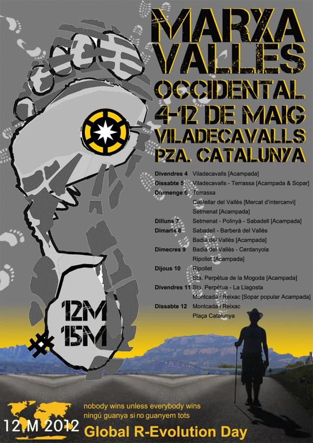 La Coordinadora d'Assemblees del Vallès Occidental ha organitzat una marxa per la comarca, entre el 4 i el 12 de maig, entre Viladecavalls i Plaça Catalunya. L'objectiu és caminar al llarg del Vallès Occidental, per tal de convocar poble a poble a la mobilització del 12 de maig, una manifestació internacional del moviment 15M.