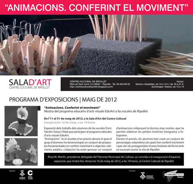 Animacions és el resultat d'un procés durant el qual el grup d'alumnes ha desenvolupat un conjunt de propostes fonamentades en conferir moviment a objectes i elements elàstics. L'objectiu ha estat generar un conjunt d'animacions mitjançant la tècnica de stop-motion que ha permès elaborar les petites històries fotograma a fotograma. Durant el procés els alumnes han creat un conjunt de personatges volumètrics als quals han conferit moviment i que són els protagonistes d'unes històries de ficció amb un escenari comú: la vila de Ripollet.