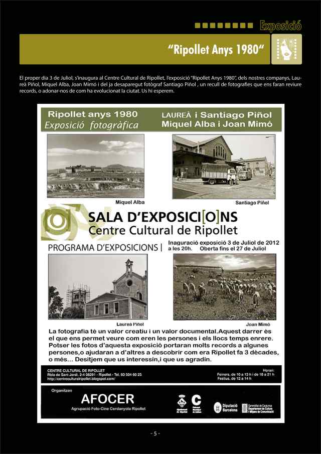 Dimarts, 3 de juliol, també a les vuit del vespre, l'Agrupació Foto-cine Cerdanyola-Ripollet presenta Ripollet, anys 80, ens mostra les fotografies de Laureà i Santiago Piñol, Miquel Alba i Joan Mimó, que mostren alguns dels espais més emblemàtics del municipi, fa més de 30 anys.