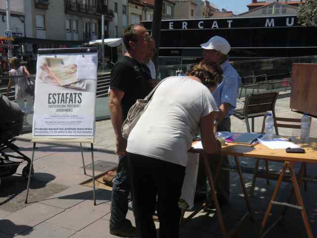 Aquest dimecres, 4 de juliol, la Plataforma d'Afectats per les Participacions Preferents ha realitzat una recollida de signatures en favor d'un manifest elaborat per la pròpia plataforma en contra de les entitats bancàries que han comercialitzat aquests productes. Tal i com van anunciar durant la darrera trobada que va realitzar aquest col·lectiu, al Teatre Auditori, es tornaran a trobar el proper dimecres, 11 de juliol, també a la plaça Pere Quart de Ripollet, per tornar a recollir signatures i posteriorment fer un recorregut per diferents bancs i caixes, entregant el manifest.