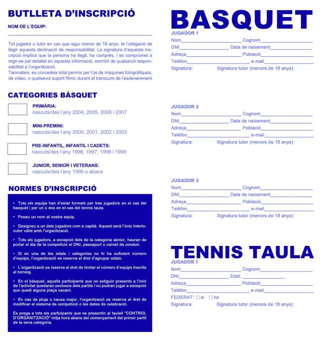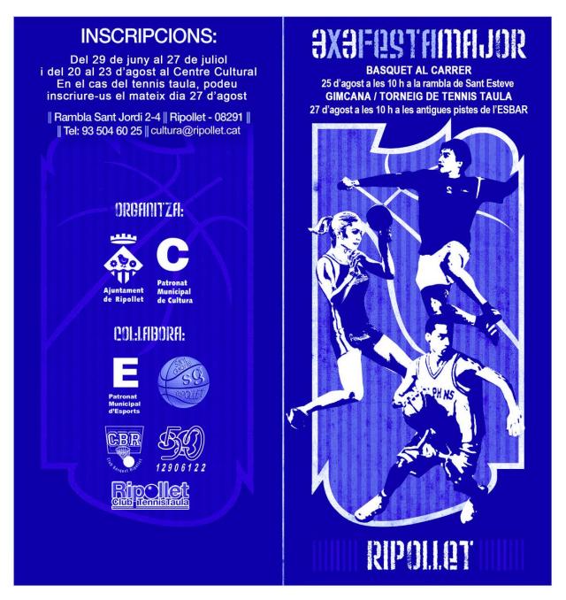 El Patronat Municipal de Cultura ha obert el termini d'inscripcions per a participar al Torneig de Bàsquet 3x3 i a la Gimcana / Torneig de Tennis Taula, que tindran lloc amb motiu de la Festa Major 2012. Durant tot el mes de juliol i del 20 al 25 d'agost es podran recollir al Centre Cultural (Rbla. Sant Jordi, 2-4) les butlletes d'inscripció i un cop omplertes lliurar al mateix Centre. També es pot fer la inscripció el mateix dia de l'activitat sempre i quan hi hagi places disponibles.