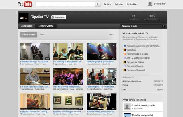 El canal Ripollet TV a YouTube ha publicat noves produccions: un vídeo sobre l'exposició del Molí d'en Rata 50 anys de les riuades, un resum sobre la passada Festa Major 2012 i les gravacions dels dos darrers plens municipals. A més, també es poden veure, entre d'altres, les peces sobre les dos mostres del Centre Cultural. Ripollet TV, impulsat per la redacció de mitjans de la Regidoria de Comunicació, compta amb una vuitantena de treballs i ha tingut, fins al moment, prop de 10.000 reproduccions.