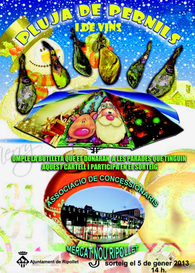 Quant al Mercat Municipal, l'Associació de Concessionaris del Mercat Nou sortejarà 10 pernils i 2 ampolles de vi entre les persones que comprin a les seves parades associades. El sorteig es farà el dia 5 de gener de 2013, a les 14 hores, al mateix mercat.