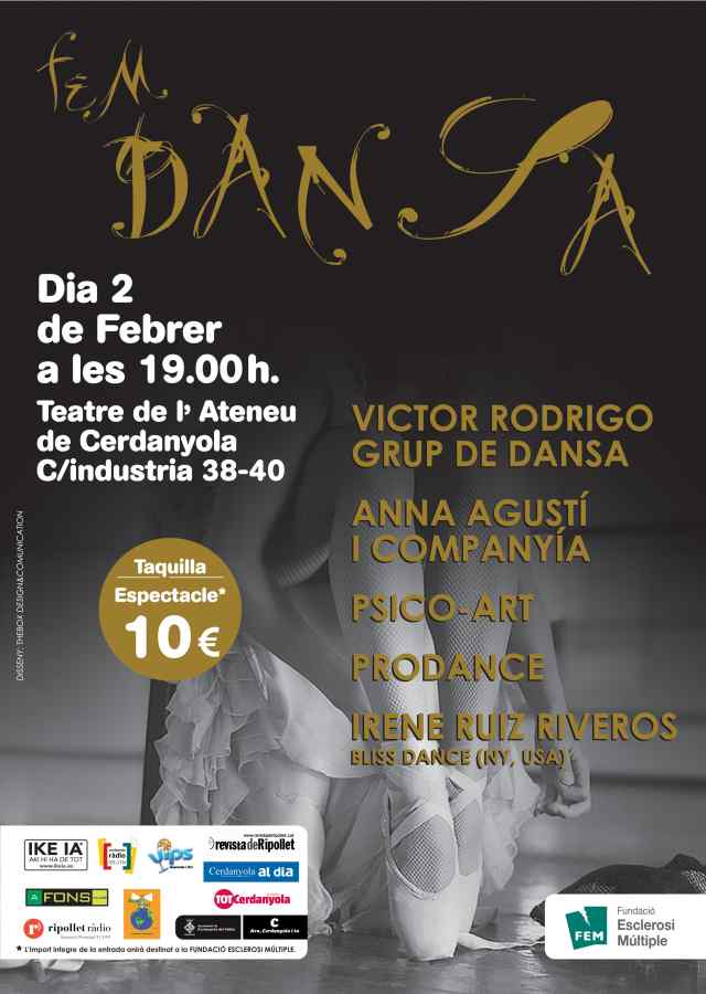 El dissabte, 2 de febrer, el grup de voluntaris de la Fundació Esclerosi Múltiple (FEM), liderats pel ripolletenc Xavier Cases, ha organitzat un espectacle de dansa al Teatre l'Ateneu de Cerdanyola a benefici de la Fundació Esclerosi Múltiple. L'espectacle començarà a les 7 de la tarda i compta amb les actuacions del grup de dansa Víctor Rodrigo, Anna Agustí i companyia, Psico-Art, Prodance i Irene Ruiz Riveros.