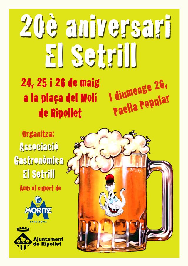 La festa del vintè aniversari d'El Setrill comptarà amb cuina i barra oberta des de la nit de divendres 24 de maig, fins el diumenge 26 al migdia. Els preus de les consumicions seran populars i també hi haurà uns tiquets solidaris, per a usuaris del banc d'aliments. L'animació de la festa començarà dissabte amb una tamborinada al matí i a la tarda hi haurà actuacions de grups de música locals. De diumenge destaca la paella popular, consistent en quatres paelles temàtiques per a un total de 800 persones, una mostra del musical Els Miserables i l'actuació del grup d'havaneres L'Espingari. Ripollet Ràdio també col·laborarà punxant música en diferents moments de la celebració.
