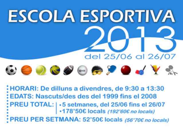 Aquesta setmana finalitza el període per inscriure's a l'Escola Esportiva del PAME i al Campus del RUA. L'Escola Esportiva 2013 se celebrarà del 25 de juny al 26 de juliol, de 9.30 a 13.30 hores i el preu és de 178,5 euros, les cinc setmanes i de 52,50 euros en inscripció per setmanes. Durant aquests dies, els nens i nenes gaudiran de jocs esportius i tradicionals, jocs a la piscina, activitats a l'aire lliure taller si manualitats. Més informació al telèfon 93 692 97 52.