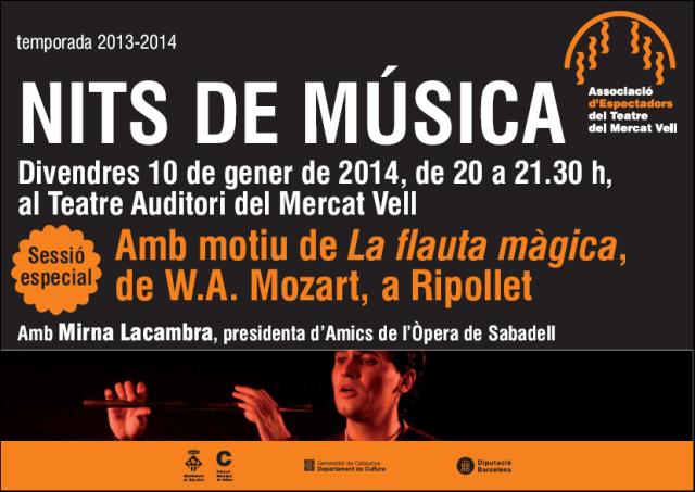 Amb motiu de La flauta màgica, es realitzarà una sessió especial de les Nits de Música, el 10 de gener en el Teatre Auditori, amb la presència de la presidenta de l'Associació d'Amics de l'Òpera de Sabadell, Mirna Lacambra, per començar a conèixer com és aquesta òpera de W. A. Mozart.