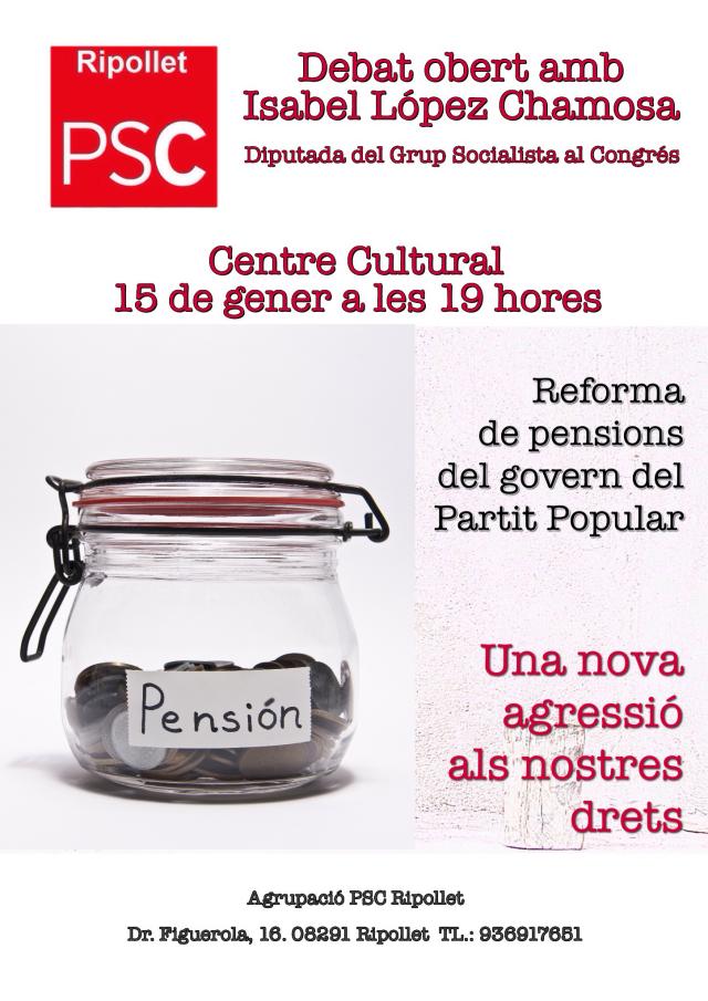 El proper 15 de gener, a les 19 hores, el PSC de Ripollet oferirà una xerrada oberta a tota la població sota el títol 'La proposta de reforma de pensions del govern del Partit Popular. Una nova agressió als nostres drets'. L'acte tindrà lloc a la sala d'actes del Centre Cultural i comptarà amb la presència d'Isabel López Chamosa, diputada del Grup Socialista al Congrés, com a ponent.
