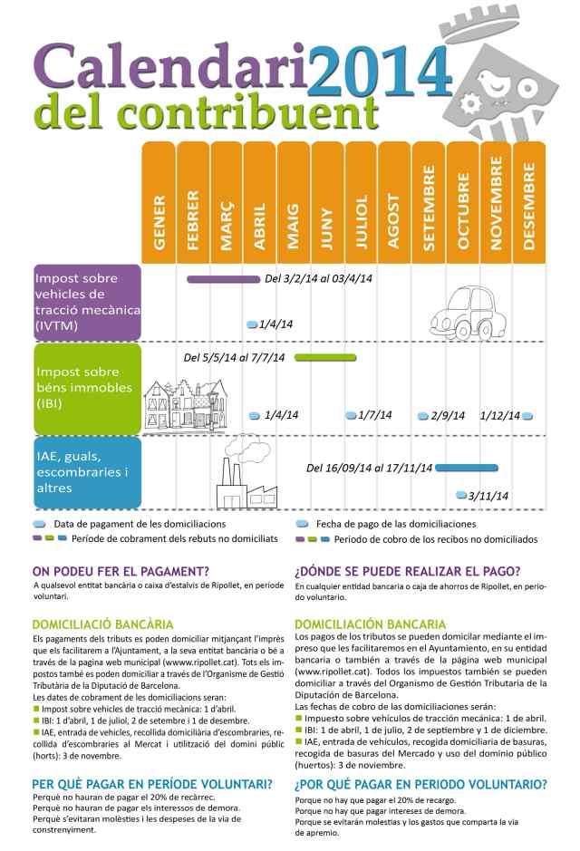Amb l'inici del nou any, comença un nou exercici fiscal i es publica el nou calendari de pagaments de les taxes i impostos municipals. Recordar que, des de l'1 de gener, l'Organisme de Gestió Tributària de la Diputació de Barcelona (ORGT), a banda de gestionar l'impost de circulació (IVTM) i les multes, també s'encarrega de la gestió, liquidació i recaptació de l'IBI, l'IAE, la plusvàlua i la taxa d'escombraries.