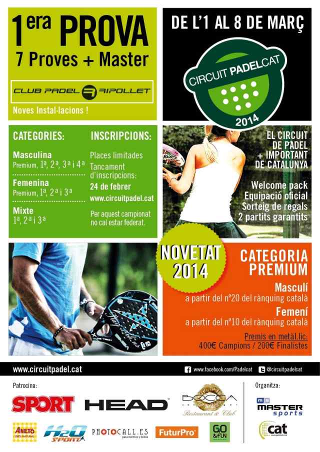 Del dia 1 al 8 de març, el Club Pàdel Ripollet organitza, la 1ª prova del Circuit Padelcat 2014, a les seves noves instal·lacions al nostre municipi, a l'av del Riu Ripoll, 35. Es tracta del torneig inaugural de les instal·lacions, que durant les darreres setmanes ha realitzat diferents jornades de portes obertes per tal que la gent que volgués provar les pistes, ho pogués fer de forma gratuïta. Fins aquest moment ja hi ha apuntades més de 80 parelles i les inscripcions van finalitzar aquest dilluns, 24 de febrer.