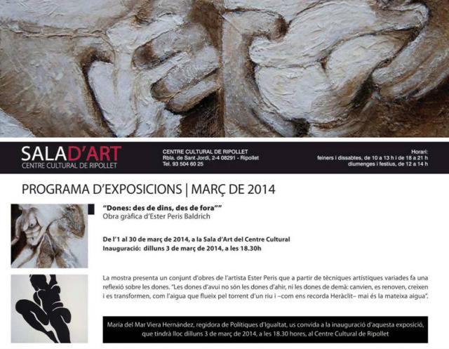 Aquest dilluns, 3 de març, a dos quarts de 7, la Sala d'Art del Centre Cultural acollirà la inauguració de l'exposició Dones: des de dins, des de fora, amb obres de l'artista Ester Peris Baldrich. Es tracta d'una mostra a través de la qual l'artista vol explicar el paper i la lluita de les dones en la societat occidental actual, de caràcter patriarcal. La mostra ha estat organitzada per la Regidoria de Polítiques d'Igualtat i forma part del programa d'activitats commemoratives del 8 de Març, Dia Internacional de les Dones.