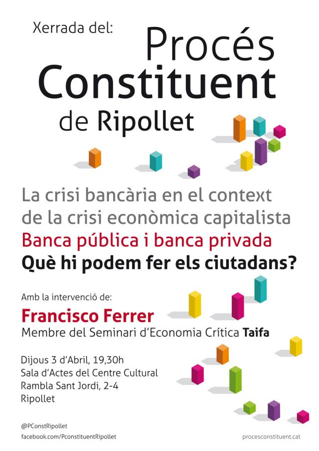 La secció local del moviment del Procés Constituent a Catalunya organitza a Ripollet una xerrada que tractarà el context actual de crisi econòmica capitalista. 'La crisi bancària en el context de crisi econòmica capitalista. Banca pública i banca privada. Què hi podem fer els ciutadans?', el 3 d'abril a Ripollet, a les 19.30 hores, al Centre Cultural. La sessió comptarà amb la intervenció del membre del Seminari d'Economia Crítica, Francisco Ferrer.