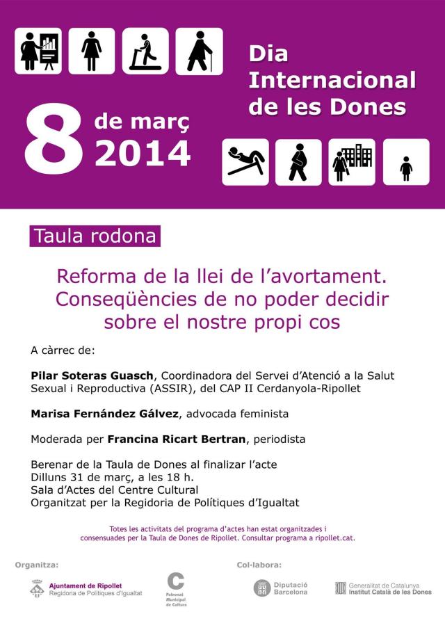 A l'acte, es debatrà sobre la Reforma de la Llei de l'avortament i les conseqüències de no poder decidir sobre el propi cos. En parlaran d'aquesta reforma, objecte de polèmica i promoguda pel ministre Gallardón, Pilar Soteras, coordinadora del Servei d'Atenció a la Salut Sexual i Reproductiva del CAP II Cerdanyola-Ripollet i l'advocada feminista Marisa Fernández Gálvez. La reunió estarà moderada per la periodista Francina Ricart.