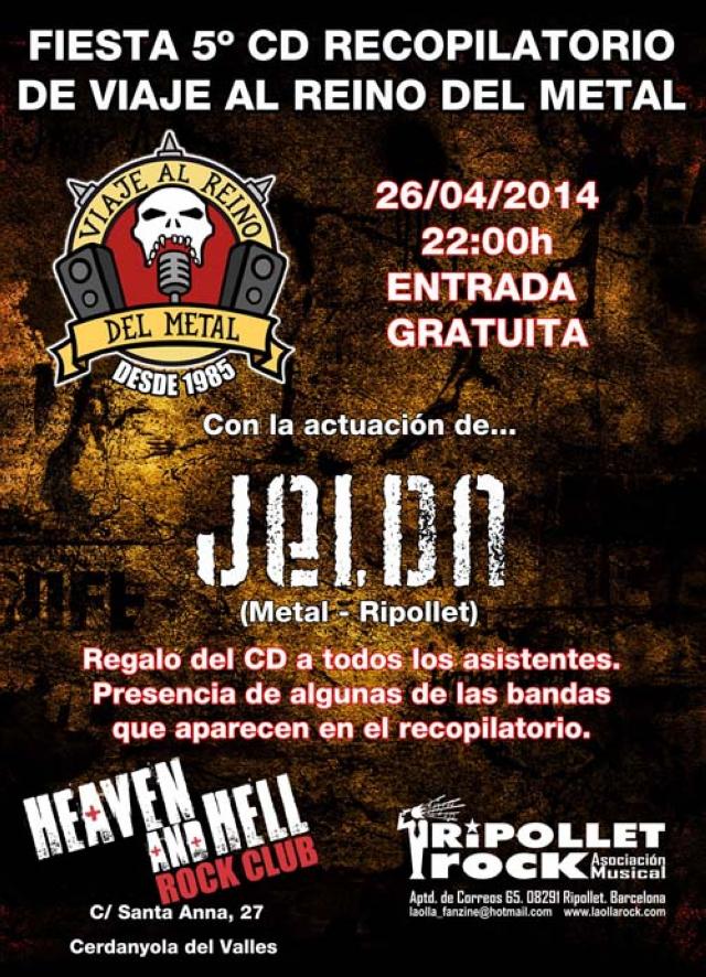 El programa de Ripollet Ràdio, Viaje al Reino del Metal i l'Associació Musical Ripollet Rock, presentaran aquest dissabte, 26 d'abril, el seu 5è recopilatori, amb una festa, que tindrà lloc a la sala Heaven and Hell Rock Club de Cerdanyola, al carrer de Santa Anna, 27. Comptarà amb l'actuació dels ripolletencs Jeldn i es regalarà el cd a tots els assistents. A més, hi haurà la presència d'algunes de les bandes que apareixen en el disc.