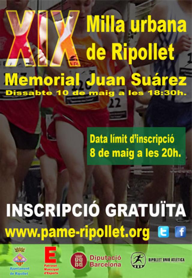 El proper 10 de maig es disputarà la XIX edició de la Milla Urbana de Ripollet - Memorial Juan Suárez. Aquesta prova, organitzada pel Ripollet Unió Atlètica amb la col·laboració del Patronat Municipal d'Esports i l'Ajuntament de Ripollet, sortirà des de la rambla Sant Jordi, a partir de les 18.30h.Per participar a la Milla només cal formalitzar la inscripció a la web del PAME www.pame-ripollet.org abans del dimecres 7 de maig.