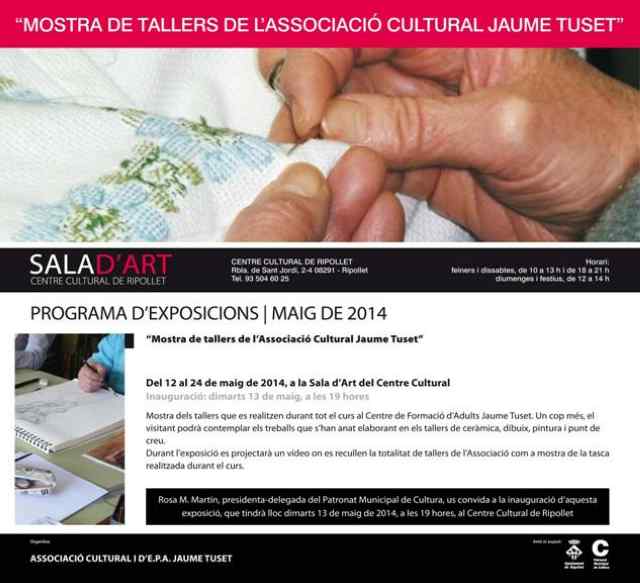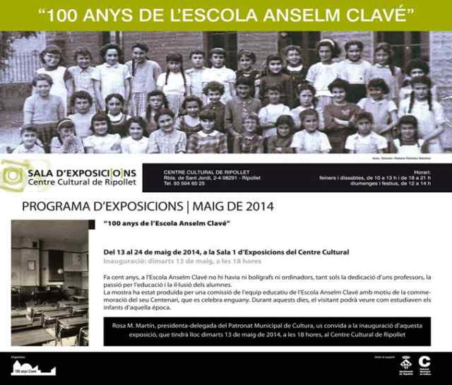 Des del dia 12 i fins al proper 24 de maig, les dues sales d'exposicions del Centre Cultural presenten noves propostes per als ciutadans de la vila. Per un costat, l'Escola Anselm Clavé celebra el centenari del centre amb una mostra plena d'objectes relacionades amb l'ensenyament, durant totes les èpoques, gràcies a les aportacions de molts exalumnes i el propi arxiu de l'escola. D'altra banda, els socis de l'Associació Cultural Jaume Tuset volen compartir amb els ripolletencs les seves habilitats en la costura.
