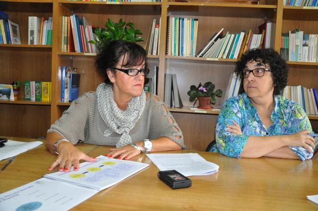 Foto 1: La regidora de Serveis Socials, Maria LLadó, i la tècnica del Departament, Montse Mas, acompanyades per treballadores socials i educadores, durant la roda de premsa.