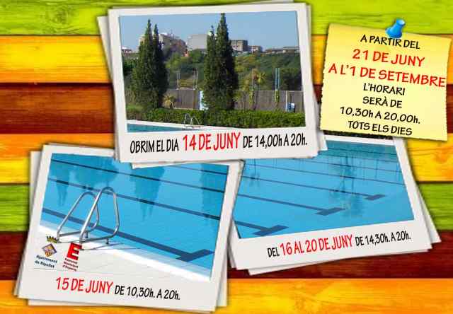 Aquest dissabte, 14 de juny obrirà la piscina descoberta del Poliesportiu Municipal. Amb motiu de la festa de cloenda de l'esport extra escolar, que es desenvoluparà al matí, dissabte obrirà de 14 a 20 hores. Del 16 al 20 de juny, l'horari serà de 14.30 a 20 hores i a partir del 21 de juny i fins a l'1 de setembre, l'horari serà de 10.30 a 20 hores.