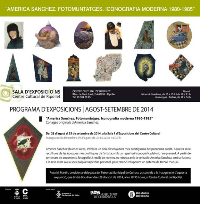 Coincidint amb l'inici de la Festa Major de Ripollet, el proper divendres, 29 d'agost, s'inauguraran dues mostres al Centre Cultural. D'una banda, a les 18.30 hores, obrirà les portes América Sánchez. Fotomuntatges Iconografia Moderna 1980-1985, amb collages originals d'América Sánchez (pseudònim de Juan Carlos Sánchez). A les 19 hores serà el torn de En blanc, una mostra d'obres de l'Escola d'Arts Plàstiques de l'Ateneu de Cerdanyola del Vallès.
