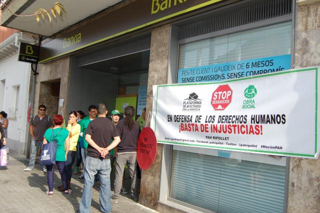 Membres de la Plataforma d'Afectats per la Hipoteca de Ripollet es van manifestar el passat dimecres, 1 d'octubre, davant l'oficina de Bankia a la rambla de Sant Jordi, per sumar-se a la campanya a nivell català #TiemblaBankia. La PAH denuncia que aquesta entitat bancària no respecta els acords signats el passat mes de febrer i que es va comprometre a valorar sobre les vies de resolució dels casos d'execució hipotecària i per facilitar el lloguer social.