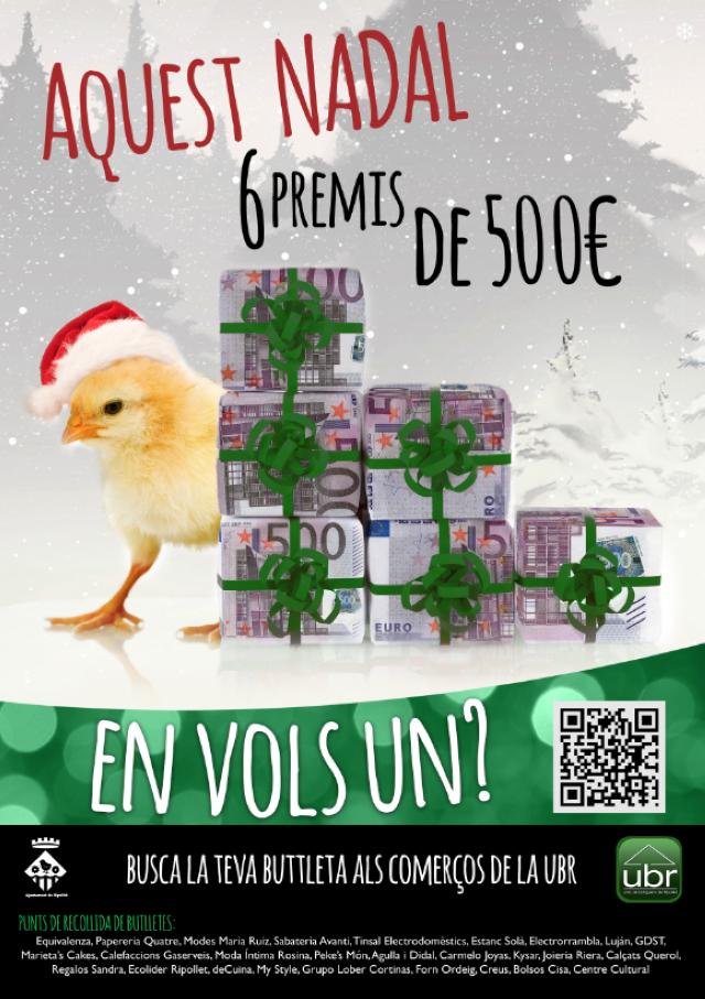 Aquest Nadal 6 premis de 500 euros...en vols un? Aquest és l'eslògan de la campanya comercial de la UBR per aquest Nadal, que ha posat en marxa aquesta setmana. Entre els clients que omplin les butlletes dels comerços associats a la UBR, se sortejaran 6 premis de 500 ripoeuros per pagar les compres del 9 al 31 de gener. El sorteig es farà el dia 8 de gener, a les 21 h, a la sala d'actes del Centre Cultural.