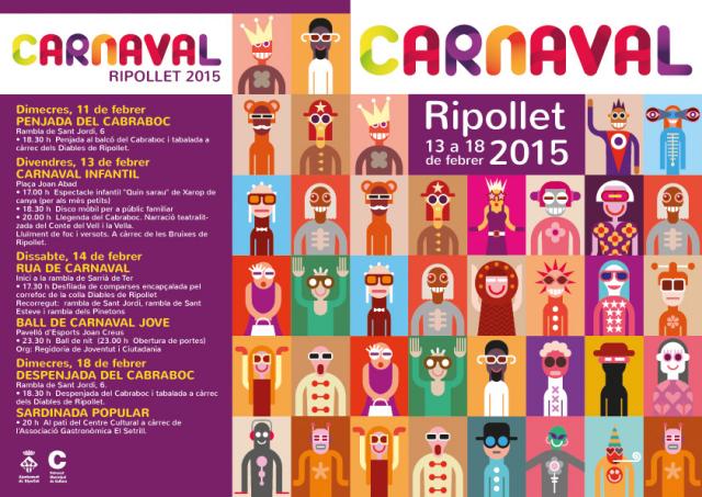 Ja s'han fet publiques les bases per participar a la Rua de Carnaval 2015, que tindrà lloc el dissabte, 14 de febrer. Les inscripcions s'han de realitzar al Centre Cultural fins el 6 de febrer. Es podran inscriure comparses, disfresses individuals i grups reduïts d'entre 2 i 5 persones. Les comparses formades per més de 10 components podran solicitar equip de música i aquelles que l'hagin de llogar rebran una ajuda del Patronat Municipal de Cultura. El PMC també destinarà 5 euros per persona a tots els ripolletencs que participin a la rua.