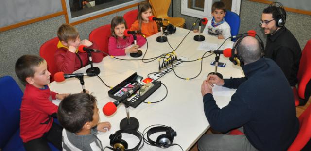 Foto: prebenjamins del Futbol Sala Ripollet als estudis de Ripollet Ràdio.