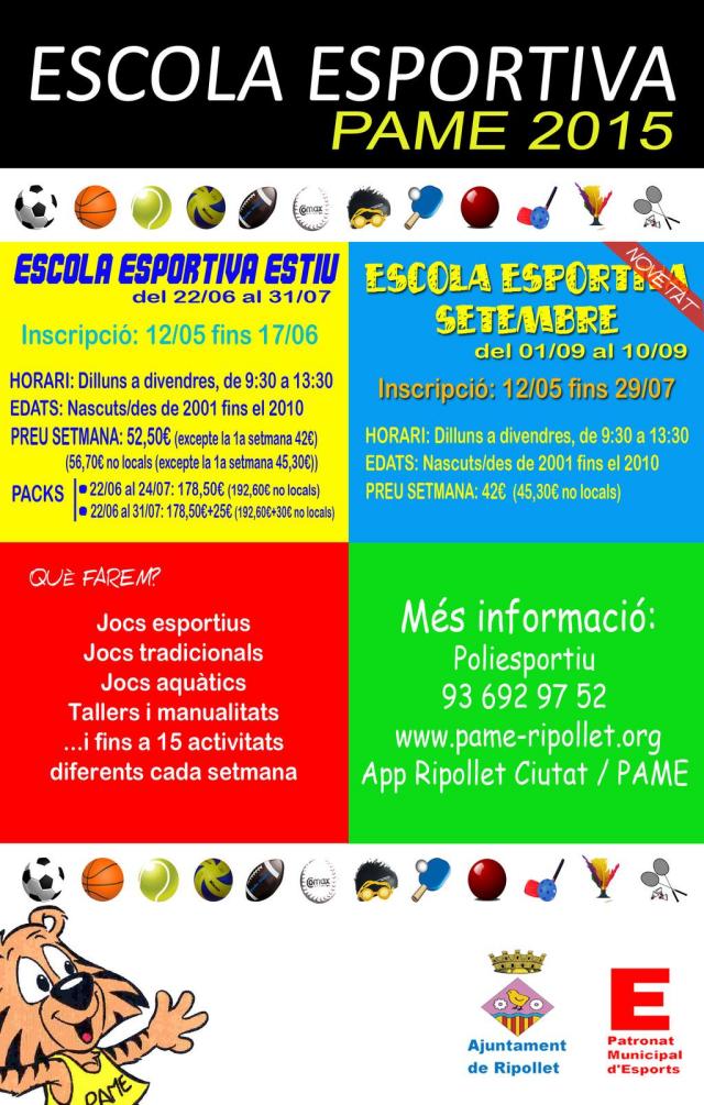 Com cada estiu, torna l'Escola Esportiva del PAME. Una oferta esportiva municipal adreçada a nens i nenes d'edats compreses entre els 5 i els 14 on es barregen els jocs esportius, tradicionals, aquàtics i fins a 15 activitats diferents cada setmana. El període d'inscripció comença el pròxim 12 de maig i durarà fins al 17 de juny. Com a novetat, enguany hi haurà Escola Esportiva de Setembre.