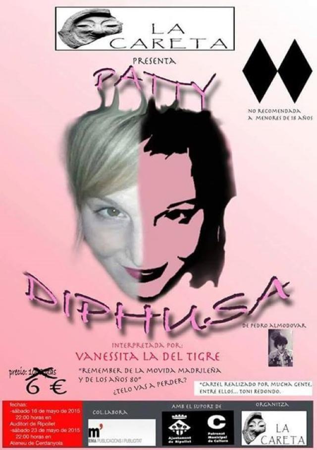 Tot és nou, excitant i rebel. Patty ens mostra la seva vida acompanyada de cançons d'aquella època. El preu de les entrades és de 6 euros. 'Patthy Diphusa' es tornarà a representar a l'Ateneu de Cerdanyola del Vallès, dissabte 23 de maig, a les 22 hores.