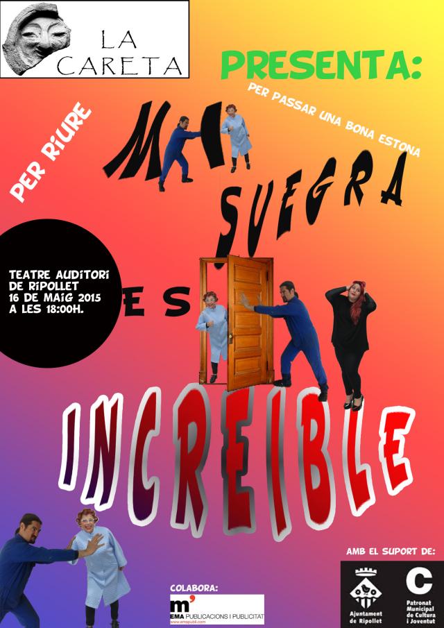 Aquest dissabte, 16 de maig, a les 18 hores, La Careta Teatre farà passar una bona estona al públic del Teatre Auditori del Mercat Vell, amb l'obra 'Mi suegra es increible'. Es tracta d'una comèdia en dos actes, apta per a tots els públics. Un home intenta fer-se passar per la seva sogra, que acaba de marxar de casa després d'una discussió, per tal de rebre un premi que només ella pot recollir en persona.