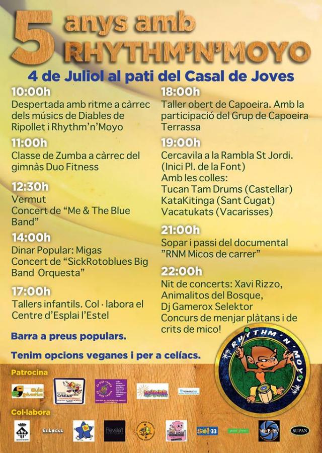 El grup de batucada Rhythm'n'Moyo celebrarà aquest pròxim dissabte, 4 de juliol, el seu cinquè aniversari. Serà al pati del Centre Cultural durant tot el dia. La jornada començarà a les deu del matí amb un acte conjunt amb la Colla de Diables de Ripollet. Tot seguit hi haurà una classe magistral de zumba a càrrec del gimnàs Duo Fitness.